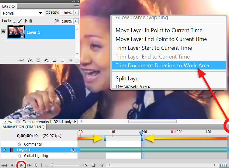 • จากนั้น กดมุมขวาบนของพาเนล ANIMATION (TIMELINE) เลือก “Trim Document Duration to Work Area” …เราจะได้ไฟล์เฉพาะส่วนที่เราใช้ครับ