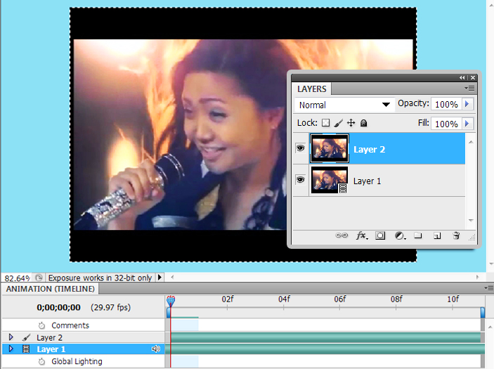 (สังเกตุในพาเนลLayer จะมี Layer เพิ่มใหม่ขึ้นมา1Layer …เป็นภาพนิ่งที่ไม่มีสัญลักษณ์Videoอยู่มุมขาวล่าง)