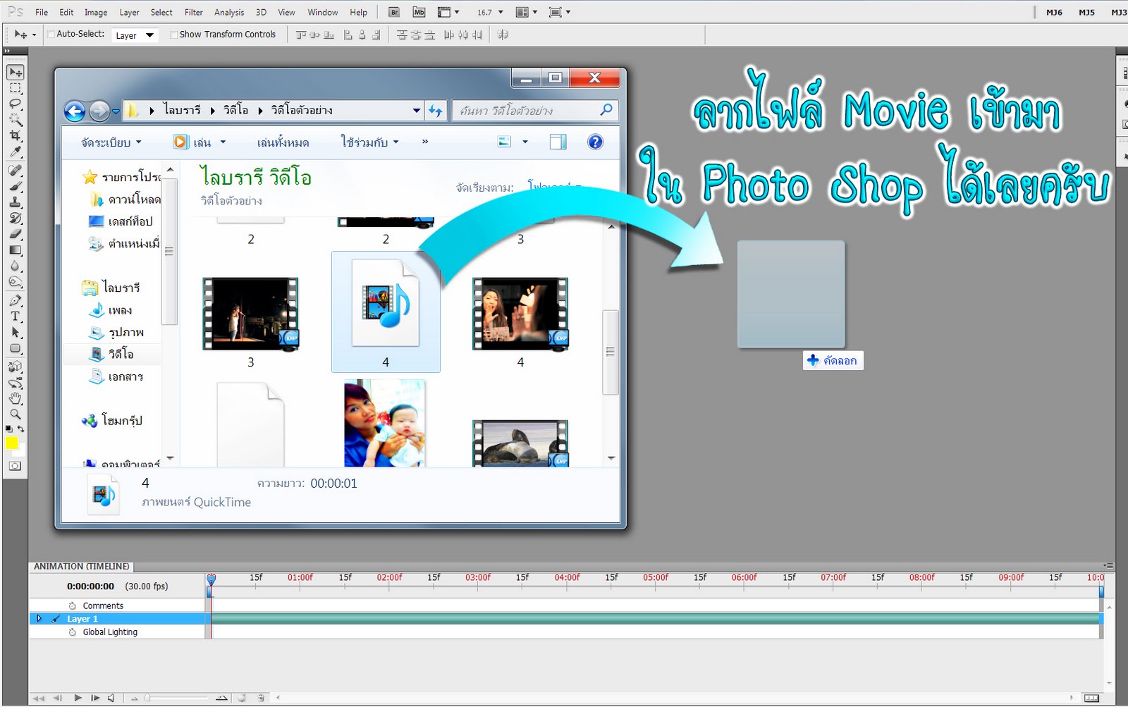 • เมื่อเปิดไฟล์Videoแล้ว สังเกตุในพาเนล Layer จะได้ Layer Video ที่มีสัญลักษณ์รูปฟิมล์อยู่มุมขวาล่าง